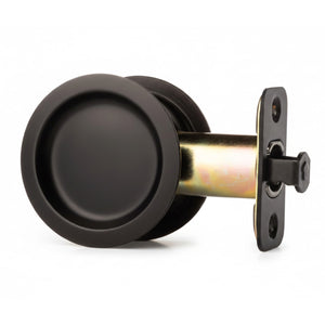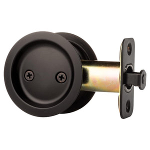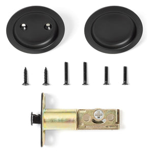 This Hall/Closet Passage Pocket Door Latch offers an innovative round design that fits a standard 2-1/8 inch bore in the door, allowing for easy installation with a standard screwdriver. It features universal handing for use on right and left sliding doors. This flat black passage pocket door lock is intended to be used on hallway and closet interior doors where no locking function is necessary.