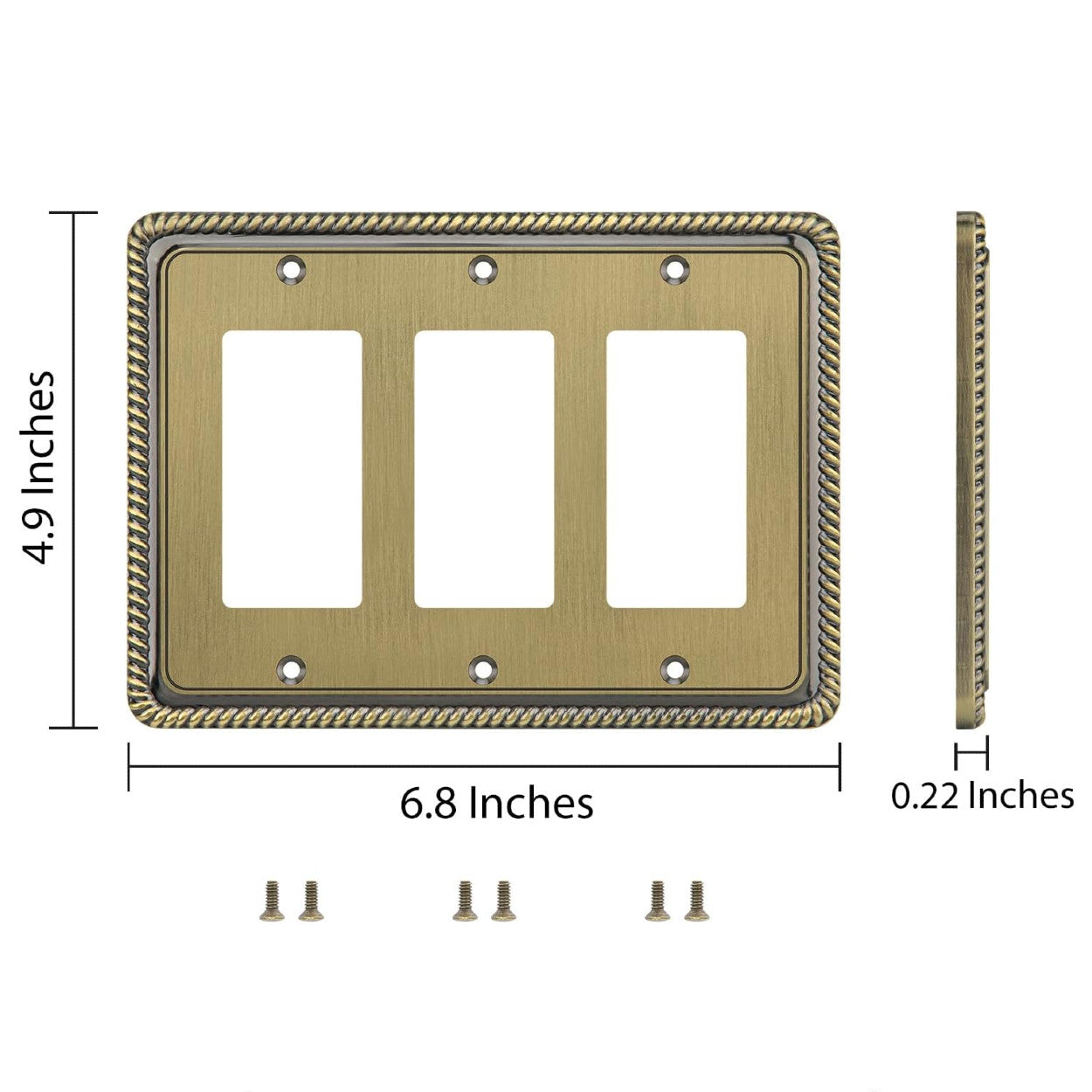 Add timeless style and lasting quality to your walls with the Harmon Antique Brass Triple Decora Rope Edge Switchplate Cover. Designed to fit three modern Decora-style devices—such as rocker switches, dimmers, smart switches, or GFCI outlets—this elegant wall plate combines durability with refined design. The decorative rope-edge border offers a classic accent that complements both traditional and transitional interiors.