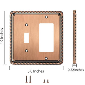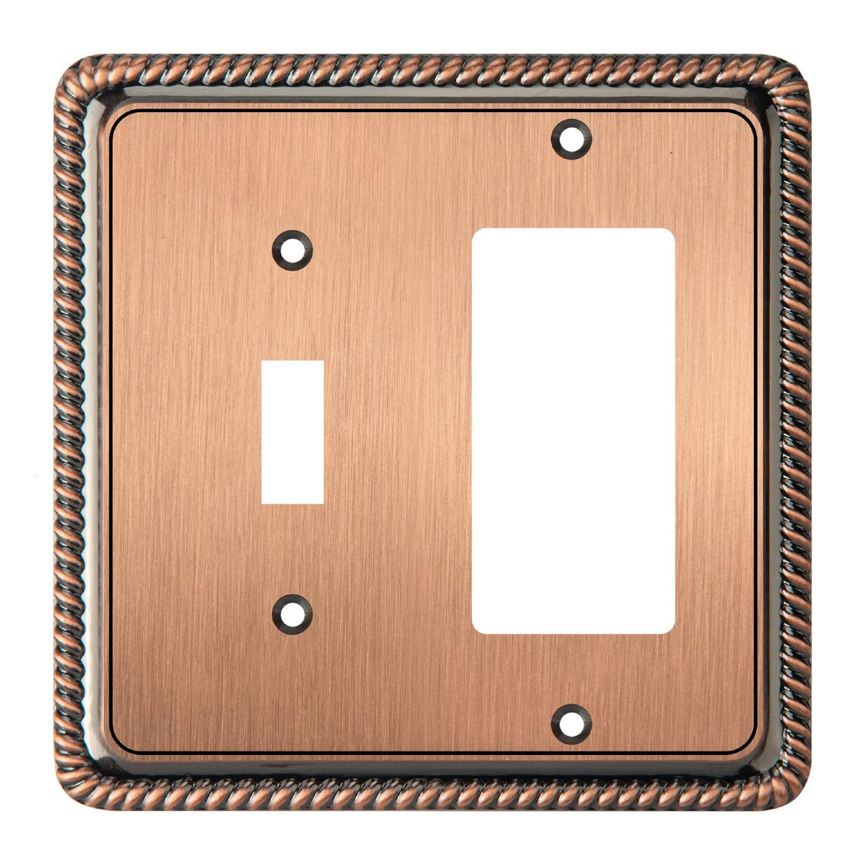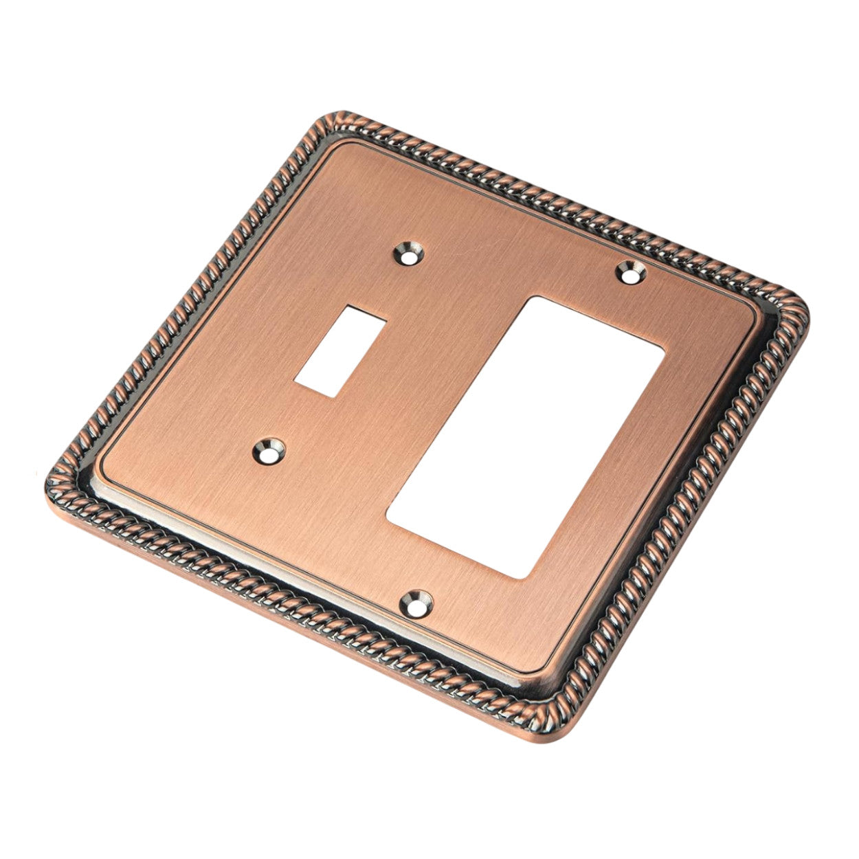 Bring warmth and sophistication to your home with the Harmon Antique Copper Single Toggle / Single Decora Rope Edge Switchplate Cover. Expertly crafted from solid zinc alloy, this durable metal wall plate pairs classic rope-edge detailing with a rich antique copper finish. Perfect for combination switch layouts, it accommodates both a traditional toggle switch and a modern Decora-style rocker or GFCI outlet—all in one elegant design.