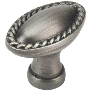 The Cosmas 4116AS Antique Silver Oblong Rope Cabinet Knob features an elongated oval shape framed by a decorative twisted rope-style border, giving it a refined, furniture-inspired look. The Antique Silver finish highlights the sculpted edge detail while providing a soft metallic tone that complements both light and dark cabinetry.