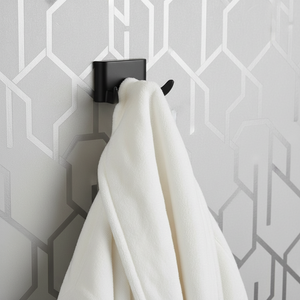 The Eclipse Series Robe Hook in Black features a sleek rectangular base with softly rounded edges and a modern two-hook design. The evenly sized curved hooks provide convenient hanging space for robes, bath towels, and everyday bathroom accessories.