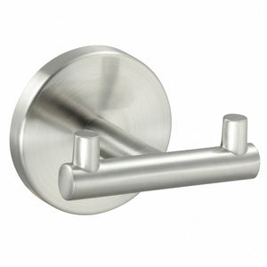 The Kain Series Double Robe Hook in Satin Nickel features a round backplate paired with a smooth cylindrical bar and two evenly sized vertical hooks. Its minimalist, contemporary design offers practical hanging space while maintaining a clean, uncluttered appearance.