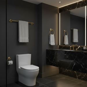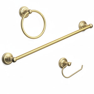 The Royal Series 3 Piece Bathroom Hardware Set in Brushed Brass is an easy way to create a coordinated, finished look in your bathroom. This matching set includes a 24" towel bar, a towel ring, and a Euro style toilet paper holder—ideal for completing a guest bath, powder room, or primary bathroom with consistent style.
