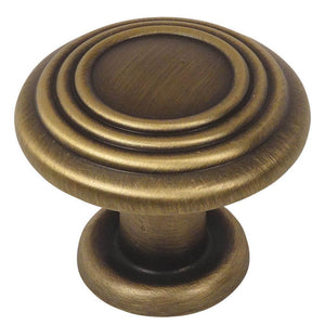 The Cosmas 4122BAB ring cabinet knob is featured here in the rich brushed antique brass finish. The time honored design of the round knob features three raised rings on the face and a round base. The 1" projection and smooth finish allows for a comfortable and easy grasp. This classic design blends into any home decor including modern, transitional or craftsman. Celebrated for its design and function, the cabinet knob coordinates beautifully with Cosmas hardware in the same finish. In an effort to stay true to an authentic antique finish, there will be variations in the finish from one item to another. This is by design in order to emulate an authentic "aged" appearance.