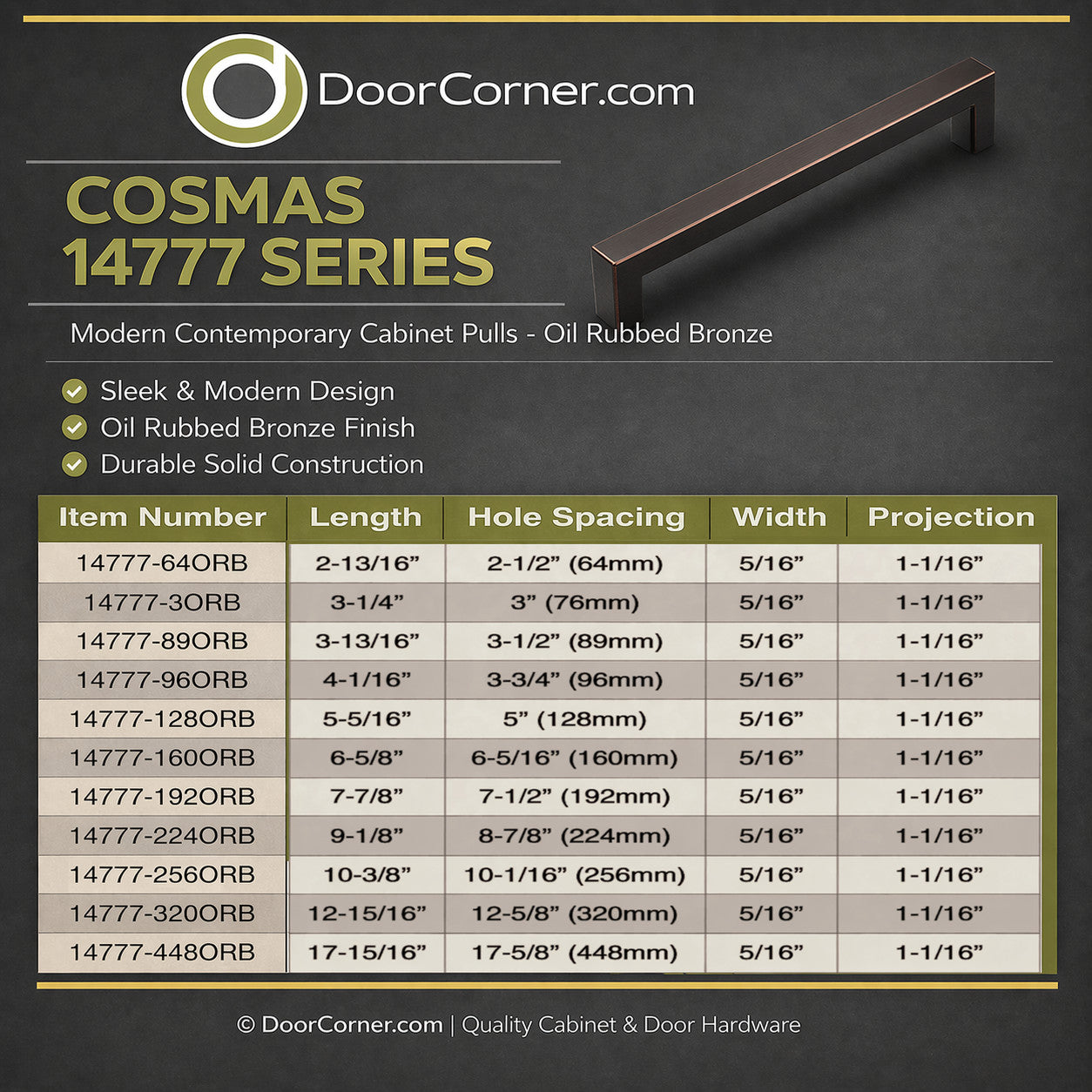 The Cosmas 14777-64ORB Oil Rubbed Bronze Modern Contemporary Cabinet Pull brings rich style and dependable function to cabinets, drawers, and furniture. Its balanced proportions and comfortable grip make it an easy fit for kitchens, bathrooms, laundry rooms, closets, and built-ins.