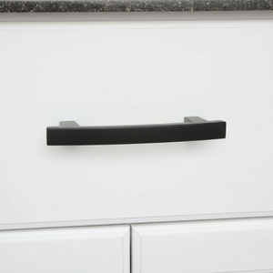 The Cosmas 5236FB Flat Black Contemporary Arch Cabinet Pull features a contemporary arched silhouette and 3-1/2" hole spacing. It is a versatile choice for kitchen cabinets, bathroom vanities, furniture drawers, and other spaces where you want durable hardware with a clean updated look.