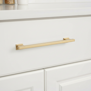 The Cosmas 702-160BG Brushed Gold Contemporary Cabinet Pull has a modern, square-edge design and coordinates perfectly with all Cosmas 702 Series Brushed Gold cabinet pulls. This sturdy drawer pull is smooth and flat on the underside and is manufactured from 100% solid die-cast zinc metal with a premium brushed brass finish.