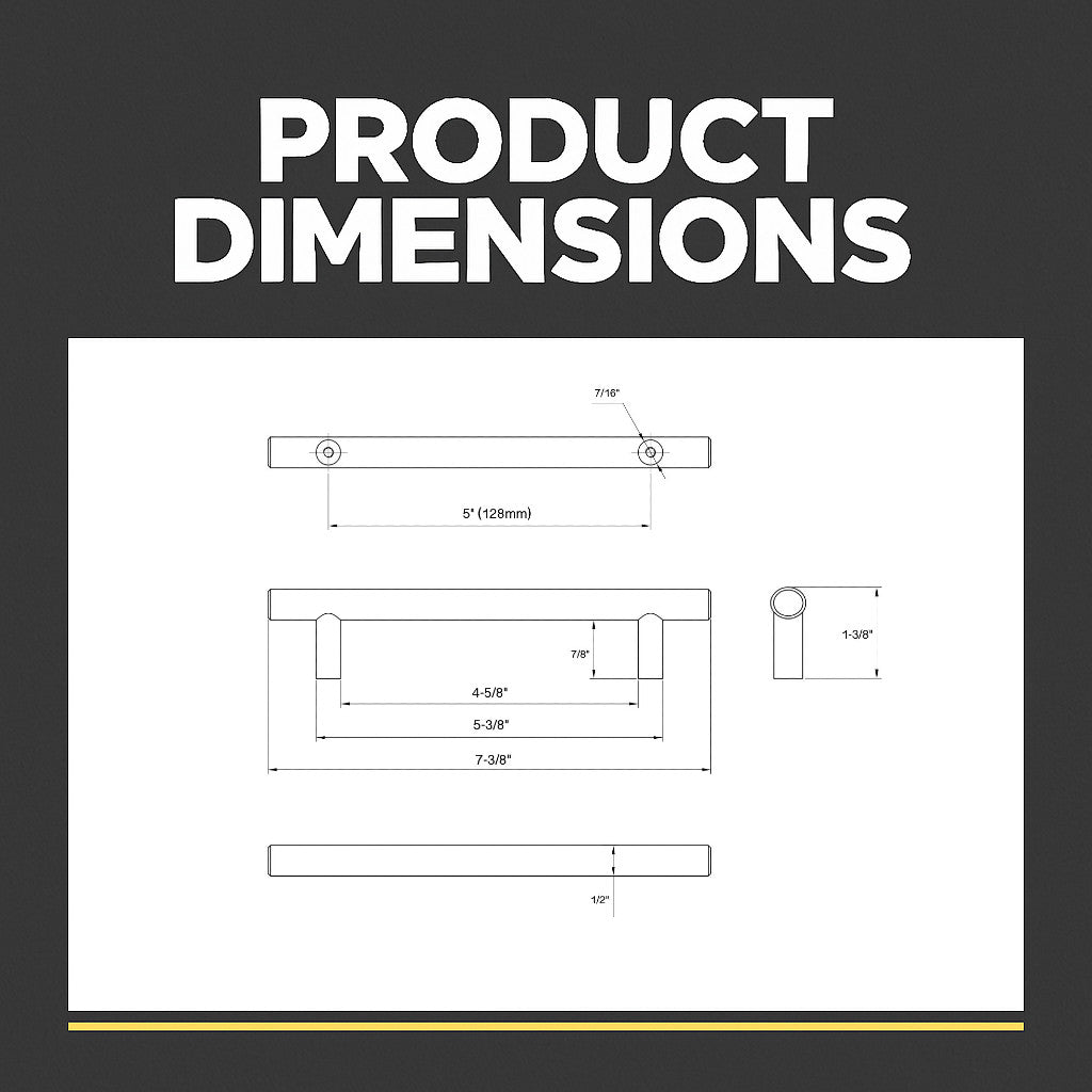The Cosmas 305-128FB Flat Black Euro Style Bar Pull has 5 inch (128mm) hole spacing and is manufactured from solid steel. This solid bar pull features a comfortable 1/2" diameter bar and slightly beveled ends that soften the edges. The plated flat black finish is protected by a polymers resin top coat, which you can expect to last indefinitely.