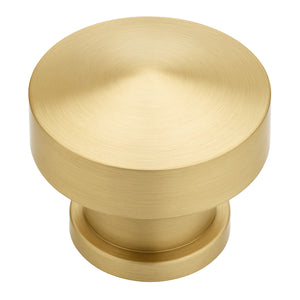 The Cosmas 704BB Brushed Brass Contemporary Cabinet Knob has a round design with a slightly convex surface and pairs nicely with all Cosmas 702 Series Brushed Brass Cabinet Pulls. This heavy cabinet knob is manufactured from 100% solid die-cast zinc metal, with a premium brushed brass finish.