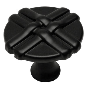 The Cosmas 7062FB cabinet knob is featured in three distinct finishes and is offered here in flat black. The round knob is part of the braided series by Cosmas, and coordinates with the Cosmas 7063FB and the Cosmas 7068FB. The face front features a woven detail that is striking and yet soft to the touch. The round knob, even with its unique design is still quite versatile and compliments many home interior decors including craftsman, transitional and farmhouse.