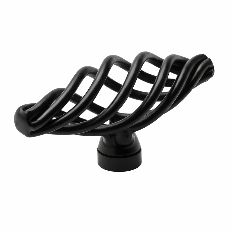 The Cosmas 9991FB Flat Black Birdcage Cabinet Knob features a distinctive open-wire design that creates a sculptural, decorative focal point for cabinetry. Its flowing curved bars form a birdcage-inspired silhouette that adds visual interest and dimension to drawers, cabinet doors, and furniture pieces.