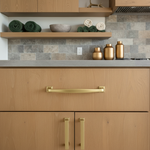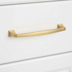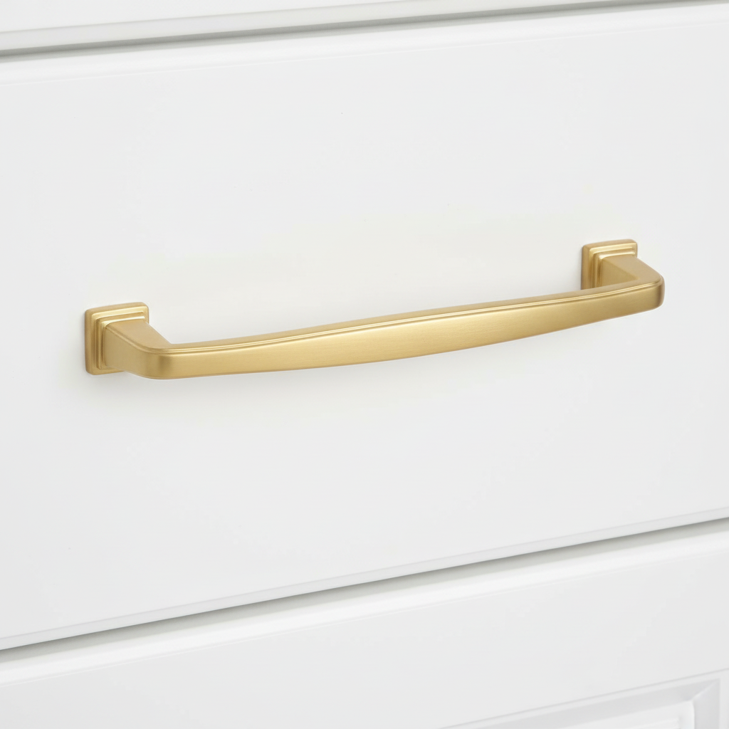 The Diversa Traditional 5" (128mm) brushed gold cabinet pull is as pleasant to the touch as it is pleasing to the eye. Photos do not do this pull justice - it's solid construction give it a heavy, sturdy weight, and the completely smooth underside elevates it's appeal when grasping. The ample size and brushed gold finish compliment the luxurious feel, and it's versatile design and is ideal for almost all bathroom and kitchen designs. This traditional cabinet drawer pull also includes two screw lengths, which makes it suitable for almost all applications.