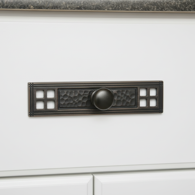 The Cosmas 10552ORB is a cabinet knob backplate in the oil rubbed bronze finish. The backplate features the classic hammered detailing, simulating hand caste hardware, along with the typical square peek-a-boo holes seen in craftsman designs. An homage to the once hand forged hardware, this replica piece provides all the details of a craftsman artisan, including its durability, without the price. Part of the Cosmas craftsman seriesin the oil rubbed bronze finish, this backplate is the perfect way to bring that handmade artistic feel to any kitchen, bathroom or furniture.