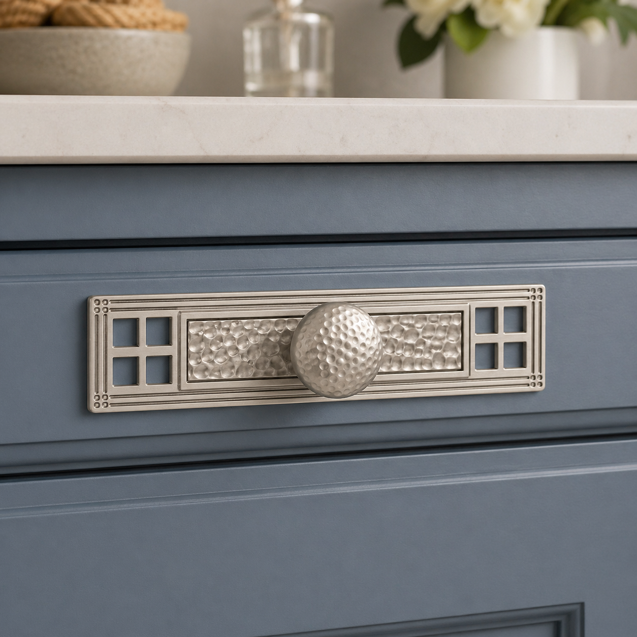 The Cosmas 10552SN is a cabinet knob backplate in the satin nickel finish. The backplate features the classic hammered detailing, simulating hand caste hardware, along with the typical square peek-a-boo holes seen in craftsman designs. An homage to the once hand forged hardware, this replica piece provides all the details of a craftsman artisan, including its durability, without the price. Part of the Cosmas craftsman series in satin nickel, this backplate is the perfect way to bring that handmade artistic feel to any kitchen, bathroom or furniture.