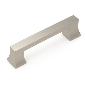The Cosmas 10556SN cabinet pull is solid metal pull in the classic satin nickel finish. Perfect for places that need different hole spacing the underside of the pull has two hole options; one for 3 inch hole centers, and another for 3-3/4 inch hole centers. The uncomplicated design of the pull features a solid rectangular bar which flanges out to square posts, giving the handle a more substantial appearance. Overall, the pull is weighty with square corners that are smooth to the touch and due to the solid smooth back, also extremely comfortable to grasp. The simplicity of the design makes this a versatile option and easy to mix and match with the complimentary hardware in the Cosmas 1055 series in satin nickel.