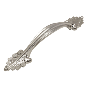 The Cosmas 10558SN satin nickel cabinet pull has a whimsical leaf feature that compliments kitchens, bathrooms or furniture restoration projects. The solid metal cabinet pull features 3-3/4" hole spacing and an intricate leaf design and artistic etchings on each ends. The face of the pull has a raised soft center lip with textured ridged lines on either side. The traditional styling of this pull also boasts a perfectly smooth backside which makes it easy to grip and gives it a feeling of superior quality.