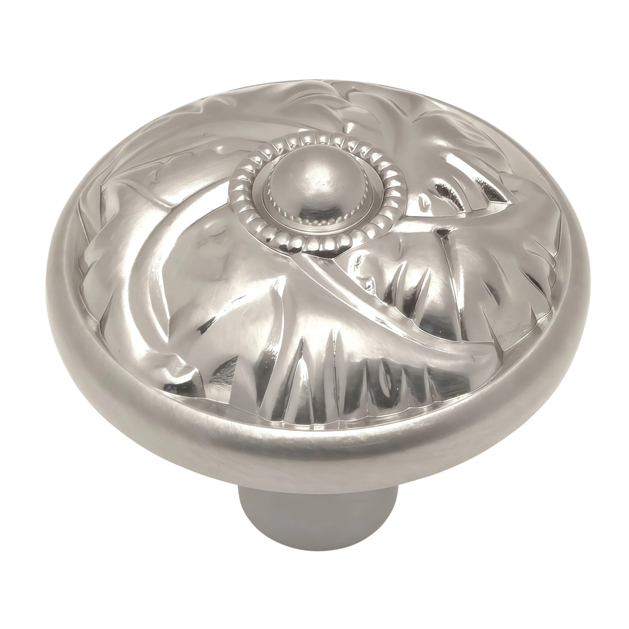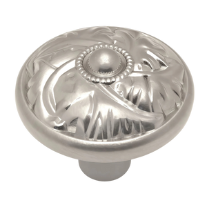 The Cosmas 10559ORB round cabinet knob with 1" projection. The unique design of the knob features leaf etchings, a small roped center and a soft to the touch round center ball. The whimsical cabinet knob is part of the Cosmas craftsman collectionin the satin nickel finish. The knob's style is versatile for kitchens, bathrooms and furniture and blends into any home design.