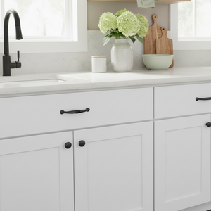 The Cosmas 2322FB cabinet pull is a 3-3/4” hole spacing handle in the flat black finish. This unique pull is solid metal and features a smooth back for easy and comfortable grasping. The center of the pull features a triple ring accent that casts a slightly darker contrast to the finish, while the feet of the pull are appointed with a soft to the touch, ball design accent. The distinctive design makes this cabinet pull unique, yet the balanced simplicity allows for easy integration into any home decor. The pull perfectly coordinates with the Cosmas 2202FB knob in the same flat black finish.