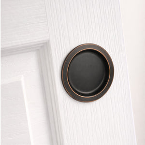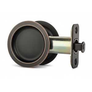 This Hall/Closet Passage Pocket Door Latch offers an innovative round design that fits a standard 2-1/8 inch bore in the door, allowing for easy installation with a standard screwdriver. It features universal handing for use on right and left sliding doors. This oil rubbed bronze passage pocket door lock is intended to be used on hallway and closet interior doors where no locking function is necessary.