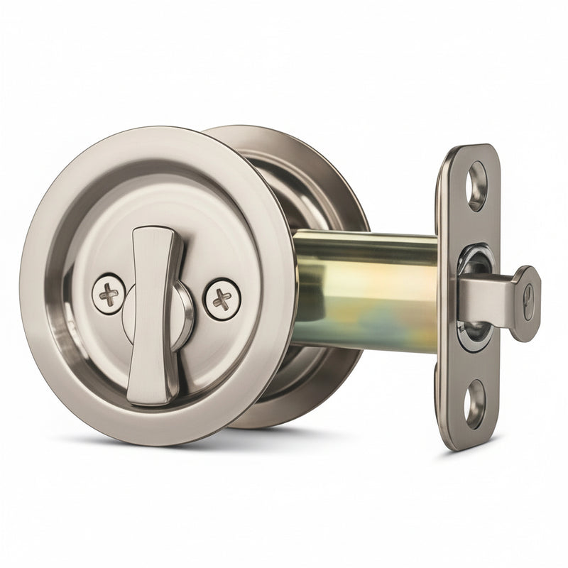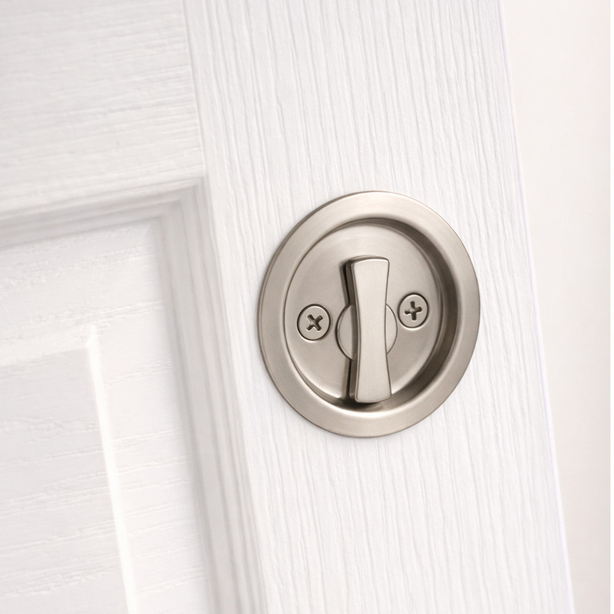 This Hall/Closet Privacy Pocket Door Latch offers an innovative round design that fits a standard 2-1/8 inch bore in the door, allowing for easy installation with a standard screwdriver. It features universal handing for use on right and left sliding doors. This satin nickel privacy pocket door lock is intended to be used on bedroom and bathroom interior doors where a locking function is necessary, and includes a emergency unlock feature on the outside of the latch.