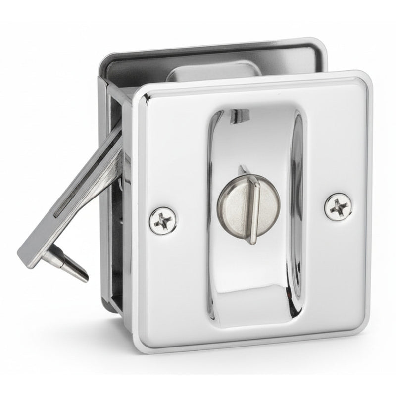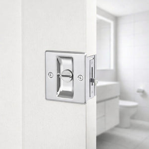 Pocket doors locks are generally available in two functions: passage (non-locking) or privacy (locking). Passage pocket door locks function as a pull, allowing you to slide the door in or out of the pocket. They’re ideal for closets, pantries and laundry rooms. The locking mechanism on privacy pocket door locks makes them ideal for bathrooms and bedrooms. Privacy pocket door locks also feature an emergency release button on the exterior side so you can easily rescue a child who’s accidentally locked themselves in the bathroom.