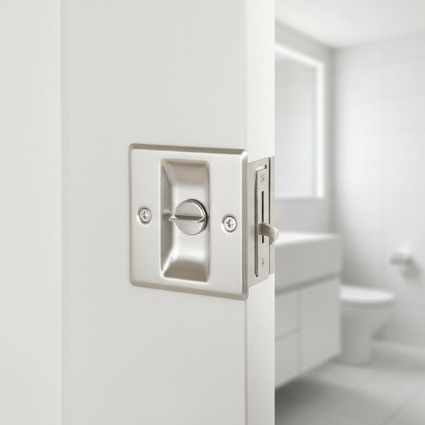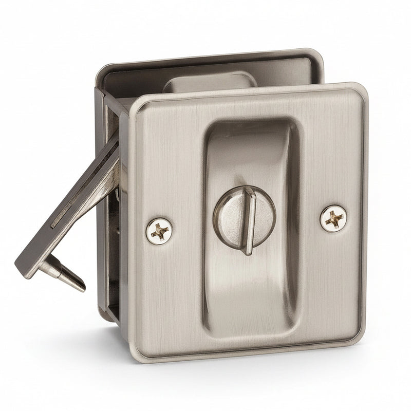 Pocket doors locks are generally available in two functions: passage (non-locking) or privacy (locking). Passage pocket door locks function as a pull, allowing you to slide the door in or out of the pocket. They’re ideal for closets, pantries and laundry rooms. The locking mechanism on privacy pocket door locks makes them ideal for bathrooms and bedrooms. Privacy pocket door locks also feature an emergency release button on the exterior side so you can easily rescue a child who’s accidentally locked themselves in the bathroom.• Locking mechanism can be positioned on either side of the door • Fits 1 3/8" to 1 3/4" Thick Doors