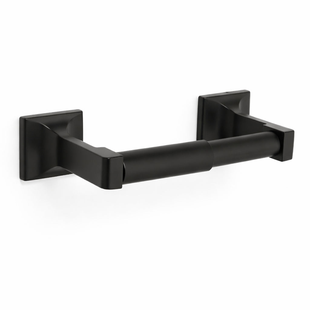 The Eclipse Series Euro Style Toilet Paper Holder in Black features a clean, modern profile with squared mounting points and a smooth cylindrical bar. Its contemporary design complements a wide range of modern and transitional bathroom styles.