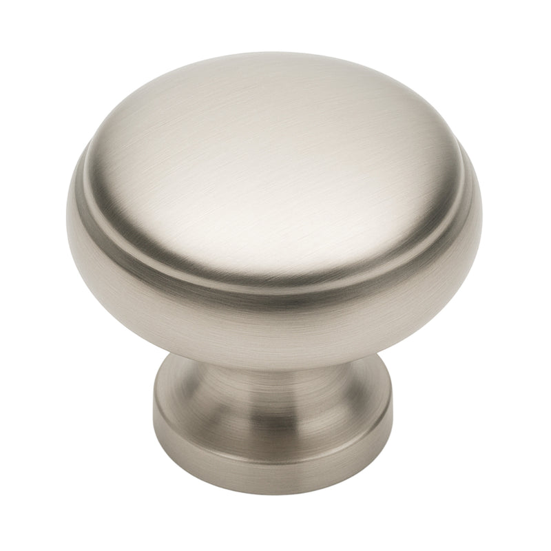 The Cosmas 1438SN is a classic round knob satin nickel cabinet knob that is perfect for any home interior design. The surprisingly heavy cabinet knob is solid metal and features a subtle beveled lip which gives the hardware a nice, understated design. The projection of the knob allows for ample room to easily grasp the handle, while the round base sits flush to the cabinet, furniture or vanity. The simplicity of this quintessential cabinet knob means that it effortlessly coordinates with most Cosmas in the satin nickel finish.