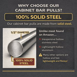 The Cosmas 305-030CH Polished Chrome Euro Style Bar Pull has 3 inch (76mm) hole spacing and is manufactured from solid steel. This solid bar pull features a comfortable 1/2" diameter bar and slightly beveled ends that soften the edges. The plated polished chrome finish is a premium finish, which you can expect to last indefinitely.