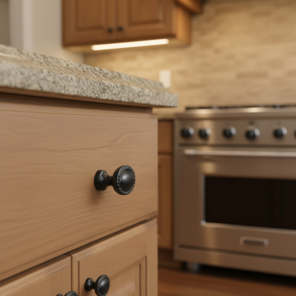 The 4116FB by Cosmas is an oblong cabinet knob with a rope design along the edge. The unique oval shape and striking details of the roped border makes for an eye-catching knob. Perfectly coordinating with the other rope cabinet hardware in the black finish, this cabinet and furniture knob is quite versatile and complimentary to many home decors including; craftsman, farmhouse, country, traditional, transitional and more.